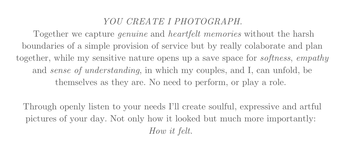 Natürlich werde ich bei den Fotos zu zweit, auf euren Wunsch, auch Anweisungen und Ideen für Posen geben, der Fokus liegt aber immer darauf, natürliche Momente entstehen zu lassen und diese einzufangen. Konzentriert euch also weniger auf perfekte Ausführung einer Pose, sondern mehr darauf, was daraus entstehen kann.